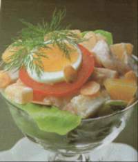 Creme Fraiche, Senf und Mayo zu einer Soße vermischen, die Zwiebel und die Senf und Mayo zu einer Soße vermischen, dieZwiebel, zerkleinerte Palmenherzen, kleingeschnittene Pilze, kleingeschnittene Paprika und die in Achtel geschnittenen Eier zufügen.
