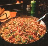 In einer kleinen Schüssel Salz, Pfeffer und Thymian vermischen. Das Hühnerfleisch darin wenden, bis es gut von der Gewürzmischung bedeckt ist. in einer großen Pfanne das Öl er- hitzen und das Fleisch unter häufigen Rüren 6-8min. anbräunen. Bleichsellerie, Zwiebeln, Paprika und Knoblauch zugeben und etwa 5min mitgaren, bis das Gemüse weich ist.
